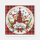 A Cute Merry Christmas Red And Black Buffalo Plaid Round Party Paper Napkin With Tree And Two Cute Reindeer