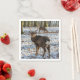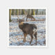 Cerf rouge sauvage dans un paysage boisé enneigé avec le cerf regardant directement la caméra.