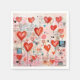 Serviettes en papier avec un motif de style média mixte amusant. De grands coeurs rouges et diverses formes aléatoires dispersés autour en faisant un motif délicieusement mignon.