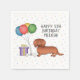 Design à thème d'anniversaire mignon avec l'illustration originale de Destei d'une robe rouge cheveux longs chien de race Dachshund. A côté du chien il y a des ballons colorés d'anniversaire attachés sur un os de chien et une boîte cadeau de couleur violet et jaune. L'arrière - plan a un motif ludique de confettis pastel colorés sur un arrière - plan blanc. Vous trouverez également une zone de texte personnalisable.