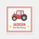 Party fournit des serviettes en papier avec un tracteur rouge avec des roues géantes. Palette de couleur rouge, blanc, noir et gris ! Parfait pour un thème de fête de tracteur. Bordure par bandes le long du côté. Ajoutez votre message de fête.