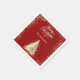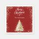 A red background and white text. Decorated with a snowcovered pine tree with golden faux glitter as snow. Merry Christmas is written with an elegant hand-lettered style script. Personalize and add your family name