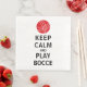 Pour votre prochaine boule de bocce se réunissent, le texte sur ces serviettes dit "Gardez le calme et Jouez au bocce". Un graphique rouge à billes est au-dessus du texte.