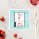 Des serviettes en papier avec une jolie illustration fantaisiste d'un drôle de renne de Noël dans un pull moche, parfait pour la saison des fêtes. Il se tient debout sur 2 jambes et brave bonjour. Il a de gros bois et un mignon casquette d'hiver tricoté vert. Texte ci-dessous dit Joyeux Noël dans une police manuscrite dans une couleur rouge festive. L'arrière - plan est un design d'aquarelle bleu glacé à l'aspect aquarelle.