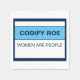 Codify Roe Les femmes sont des gens. Roe doit être le socle des droits des femmes en matière de soins de santé, pas le plafond. Et maintenant, même cela n'existe pas. Dites au Congrès qu'il est temps qu'ils fassent le moins possible pour la santé, la sécurité et l'égalité des femmes, parce que les femmes sont des personnes, et que l'avortement, quelle que soit la raison, est la santé. Description du design : L'espace design est un arrière - plan blanc avec une bordure bleu foncé. Dans la partie supérieure de l'espace design, les mots "Codify Roe" dans une police sans serif bleu foncé. En dessous, une large bande bleue claire avec des bordures de dessus et de fond bleu foncé assorties. Sous la bande, dans la moitié inférieure du dessin, les mots, "Les femmes sont des gens."