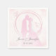 Un ensemble de serviettes en papier avec un beau design mariage romantique des silhouettes baisantes encadrées de la mariée et du marié contre un arrière - plan rose onirique. Personnalisez avec les noms du couple et la date du mariage !
