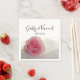 Customisez la jolie rose rose sur papier Mariage blanc serviettes avec les noms personnels de la mariée et du marié et date à utiliser dans une salle de jardin classe douche nuptiale ou mariage réception et cocktail heure. Ces élégantes serviettes botaniques jetables personnalisées sont ornées d'une photo florale d'une fleur de rose rose et d'un voile de mariée blanc.