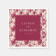 Ce modèle de serviette de mariage présente un panneau bordeaux central avec une typographie serif élégante, entouré d'un motif floral complexe de roses rouges et de petits oiseaux sur des branches. La palette de couleurs comprend du bordeaux profond, diverses nuances de rouge et de rose, contrastant avec un fond crème, créant une esthétique romantique et intemporelle. Le style d'inspiration vintage combine des motifs classiques avec des techniques d'illustration numérique épurées, offrant une sensation sophistiquée et fantaisiste parfaite pour célébrer l'amour et l'engagement.