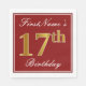 Ce design simple et élégant de serviette en papier comporte un message comme « Anniversaire de FirstName 17 ans » (avec le « 17 » ayant une couleur dorée factice) dans une zone carrée de couleur rouge avec un simple contour de bordure. Le nom est dans un texte de type écriture de couleur blanche et peut être personnalisé. Des serviettes comme celles-ci pourraient peut-être être utilisées lors d'une fête d'anniversaire pour quelqu'un qui célèbre son dix-septième anniversaire.