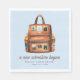 Baby shower à thème aventure avec illustration d'un sac à dos en cuir marron orné de nature sauvage, de camping, et de patchs à thème randonnées avec deux biberons sur les côtés. L'Arrière - plan est bleu.