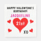 Joyeux anniversaire de la Saint Valentin écrit en typographie noire. Nom en rose assez vif. 21e ou tout âge écrit dans le coeur plus grand. Petits coeurs rouges et XO contre arrière - plan blanc. Oeuvre originale et design de TamiraZDesigns.
