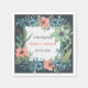 Une belle serviette en papier mariage qui a la conception d'un cadre floral avec des feuilles contre un arrière - plan foncé, dans le style de l'aquamarine foncé, illustrations texturées, aquarelle et couleurs vives de bleu cool, saumon et vert.