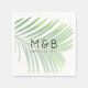 Chic, moderne, et minimaliste feuille de palmier ou frond monogrammed de mariage de plage tropicale serviettes avec 1 unique grand feuillage de palmier avec simple logo noir et blanc monogramme imprimé sur le dessus. Ajoutez vos initiales et votre date de mariage pour une conception facile qui aura un impact important à une réception, une douche nuptiale, ou un dîner de répétition pour un mariage de destination.