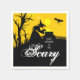 Une méchante sorcière et son chaudron, une chauve-souris noire, une clôture de piquetage et une silhouette d'arbre nue contre un ciel éffrayant, ces serviettes en papier de la fête d'Halloween portent les mots "Mangez, Buvez et Soyez Effrayant". CORRESPONDRE des articles dans notre magasin.