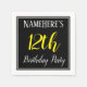 Cette conception simple et élégante de serviette en papier comporte un message comme "NameHere’s 12th Birthday Party", avec le "12th" en texte jaune soigné, dans une zone de couleur noire carré avec un contour de bordure simple. Le nom peut être customisé. Des serviettes comme celles-ci pourraient être utilisées à une fête d'anniversaire pour quelqu'un qui célèbre son douzième anniversaire. [~Z0000150]