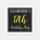 Cette conception simple et élégante de serviette en papier comporte un message comme "AnameHere’s 17th Birthday Party", avec le "17th" en texte jaune raffiné, dans une zone de carré de couleur noire avec un contour de bordure simple. Un nom personnalisé peut être utilisé. Des serviettes comme celles-ci pourraient être utilisées à une fête d'anniversaire pour quelqu'un qui célèbre son dix-septième anniversaire. [~Z0000150]