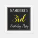 Cette conception simple et élégante de serviette en papier comporte un message comme "NameHere’s 3rd Birthday Party", avec le "3rd" dans un texte de couleur jaune raffiné, dans une zone carré de couleur noire avec un contour de bordure simple. Un nom personnalisé peut être utilisé. Des serviettes comme celles-ci pourraient être utilisées à une fête d'anniversaire pour quelqu'un qui célèbre son troisième anniversaire. [~Z0000150]