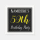 Cette conception simple et élégante de serviette en papier comporte un message comme "NameHere’s 59th Birthday Party", avec le "59th" en texte jaune raffiné, dans une zone carré de couleur noire avec un contour de bordure simple. Le nom peut être personnalisé. Des serviettes comme celles-ci pourraient être utilisées à une fête d'anniversaire pour quelqu'un qui célèbre son cinquante-neuvième anniversaire. [~Z0000150]