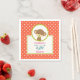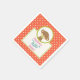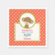 Des serviettes en papier baby shower personnalisées avec un mignon singe tenant une sucette dans sa bouche à l'intérieur d'un cercle avec une bordure verte d'olivier. L'arrière - plan est un motif à pois orange et blanc.