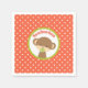 Des serviettes en papier avec un mignon petit singe tenant une suce dans sa bouche à l'intérieur d'un cercle avec une bordure verte d'olivier. Le mot Nomnomnom au-dessus de sa tête, qui peut être customisé avec un nom ou un autre texte. L'arrière - plan est un motif à pois orange et blanc.
