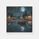 Un squelette portant un casquette de baseball rouge est assis dans un petit bateau sur un canal tranquille au clair de lune, avec des cabines douillets le long du rivage