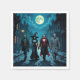 Des serviettes en papier de fête d'Halloween avec de l'art de l'ai représentant une sorcière, un vampire, une maman et un zombie marchant à travers la nuit d'Halloween avec une pleine lune dans un style de bande dessinée cool.