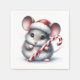 Une mignonne souris moelleuse porte un chapeau de Père Noël et tient un grand sucre de canne rayé