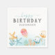 Serviettes de fête anniversaires de enfants à thème océanique avec des poissons tropicaux aquarelles, étoiles de mer, méduses et plantes de mer, la célébration disant "heureux anniversaire", et le nom des enfants.