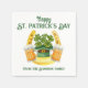 Cette serviette de soirée de la Saint Patrick présente un thème festif shamrock vert et or. L'image présente deux tasses à bière de chaque côté d'un casquette leprechaun rempli de quatre trèfles à feuilles. Un fer à cheval à cheval doré encadre l'image.