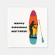 Ces serviettes personnalisées pour fêtes sont parfaites pour les fêtes d'anniversaire à thème et autres événements spéciaux. Ils présentent une illustration d'un SUP ou d'une planche à pédales debout et d'une pagaie illustrée en couleurs vibrantes du coucher de soleil avec une illustration en silhouette en noir de quelqu'un qui pagaie. Votre message apparaît à côté du graphique en lettres noires en gras.