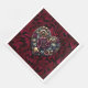 De jolies serviettes mariages bordeaux à thème steampunk. Fleurs métalliques brillantes en or, cuivre et arrière - plan paisley bordeaux.