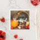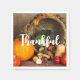 Des serviettes en papier avec la photo d'une récolte d'action de grâce, disposées sur une table en bois rustique. Citrouille, pommes de terre, courge etc... composent cette belle collection de nourriture. Des feuilles d'automne colorées entourent le panier de la cornucopie.
