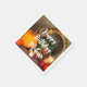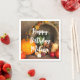 Des serviettes en papier avec la photo d'une récolte d'action de grâce, disposées sur une table en bois rustique. Citrouille, pommes de terre, courge etc... composent cette belle collection de nourriture. Des feuilles d'automne colorées entourent le panier de la cornucopie.