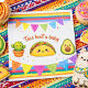 Adorable “Taco ’Bout a Baby” fiesta baby shower design featuring cute kawaii taco, avocado, and cactus characters with colorful serape accents. Perfect for a fun Mexican-themed celebration.