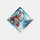 Un ours en peluche brun dans un casquette, des oreilles et une écharpe rouge construit un petit bonhomme de neige dans une forêt d'hiver