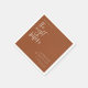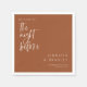 Dîner de répétition minimaliste pour mariage serviette de bienvenue avec texte écrit à la main qui dit "bienvenue à la veille". La couleur est en terre cuite poussiéreuse.
