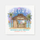 Les serviettes d'anniversaire Tiki sont décorées d'une aquarelle Tiki bar sur la plage la nuit sous la lune et d'étoiles avec des palmiers, des lampes à cordes, des torches Tiki et un accueil hawaïen "Aloha". Cocktails tropicaux, ananas, hibiscus et feuilles de palmiers, planche de surf et perroquet dans un casquette pirate décorent l'espace bar. Art par KL Stock