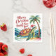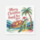 Une carte de voeux de Noël fantaisiste avec une aquarelle joyeuse illustrant une tortue de mer portant un chapeau de Père Noël festif et ornée de lumières scintillantes de Noël enfilées autour de sa coquille, posée sur fond de palmier balançant également éclairé par des lumières chaudes et un océan turquoise serein. La coquille de la tortue est peinte de motifs complexes de fleurs tropicales dans les tons pastel doux de corail, lavande et vert d'eau de mer, tandis que l'océan brille avec de subtils gradients de bleu et d'argent, créant une atmosphère paisible mais festive. "MERRY CHRISTMAS & HAPPY NEW YEAR" apparaît dans une police ludique et lettrée sur le dessus de la carte, avec l'intérieur offrant un espace blanc propre pour un message personnalisé et un motif subtil et répétitif de petits coquillages le long du bord inférieur pour renforcer le thème tropical. Le ton général est léger et joyeux, parfait pour envoyer des voeux chaleureux à des amis et à la famille pendant la période des fêtes.