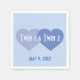 Cette adorable serviette présente des coeurs attenant dans différentes nuances de bleu et de texte modèle pour la date d'une occasion spéciale. Le design est parfait pour un baby shower jumeau, baptême ou fête d'anniversaire. L'image à double coeur est également appropriée pour une fête de fiançailles, un mariage, une douche nuptiale ou une célébration d'anniversaire.