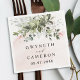 Le design présente des éclaboussures d'aquarelle rose pâle ou rousse avec des éclaboussures imprimées en or simulées. Le design présente également des éléments floraux rose vif dans un bouquet ou une couronne de verdure. La couronne contient un succulent eucalyptus et d'autres éléments de verdure dans les tons vert émeraude foncé, vert sauge, bleu poussiéreux et plus pour s'adapter à toutes les saisons que votre mariage peut tomber dans et les couleurs qui complètent la couleur rougir.