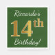 Ce design simple de serviette en papier comporte un message comme "14e anniversaire de Riccardo!", avec le "14e" à l’allure fausse or, sur un arrière - plan de couleur verte. Le nom peut être personnalisé. Il pourrait être utilisé à une fête d'anniversaire pour quelqu'un qui célèbre son quatorzième anniversaire. [~Z0000081]