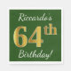 Ce design simple de serviette en papier comporte un message comme "64e anniversaire de Riccardo!", avec le "64e" à l’allure fausse or, sur un arrière - plan de couleur verte. Le nom peut être personnalisé. Il pourrait être utilisé à une fête d'anniversaire pour quelqu'un qui célèbre son soixante-quatrième anniversaire. [~Z0000081]