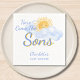Cette serviette de baby shower pour jumeaux garçons est décorée d'un soleil aquarelle jaune, de nuages et d'une typographie bleue élégante. Facilement personnalisable. Aquarelle originale © Michele Davies.