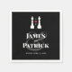 Serviettes pour un mariage gay avec un thème d'échecs, avec deux pièces king en haut de la serviette. Ajoutez vos initiales entre les pièces d'échecs avec un coeur rouge. Vos noms dans une grande police audacieuse et élégante avec une belle esperluette en dessous en gris foncé contre un arrière - plan noir.