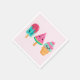 Serviettes en papier avec une illustration de 3 gâteries différentes à la crème glacée. Un coquelicot bleu-vert avec des gouttes de fraises et des arrosages colorés. Un popsicle de pastèque. Un cône avec des couches de délicieuses glaces en rose et menthe. Tous avec mignon kawaii sourit.