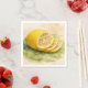 Une aquarelle représentant un citron partiellement coupé pour révéler des segments de papier à musique, reposant sur une feuille verte dépliée avec des gouttelettes de jus scintillantes. Une nature morte fraîche et naturelle mêlant la luminosité des agrumes à l'harmonie musicale.
