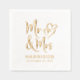 Serviettes élégantes pour votre fiançailles, dîner de répétition, réception de mariage et autres événements mariages mettant en vedette "Mr & Mrs" dans un grand script chic, une illustration de deux coeurs réunis et votre nom marié et votre date de mariage, le tout estampillé en or réel, argent ou rose feuille d'or.
