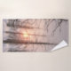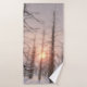 Un soleil d'hiver pâle se couche derrière des mélèzes imposants comme des sentinelles sombres. Leurs branches grillées, nues, sauf pour un piqué de neige, et les dorures pastel, roses et bleus du ciel couché de soleil sont vus comme à travers une brume rêveuse. Au premier plan, les flocons de neige tombent doucement.