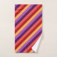 Un ensemble de serviettes de bain avec un motif motif coloré de bandes diagonales en rouge cerise, rose melon, violet, violet prune et jaune banane.