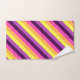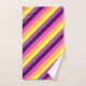 Un ensemble de serviettes de bain avec un design motif mignon et coloré de bandes diagonales en prune violet, lavande, jaune citron, orange melon et magenta lumineux.